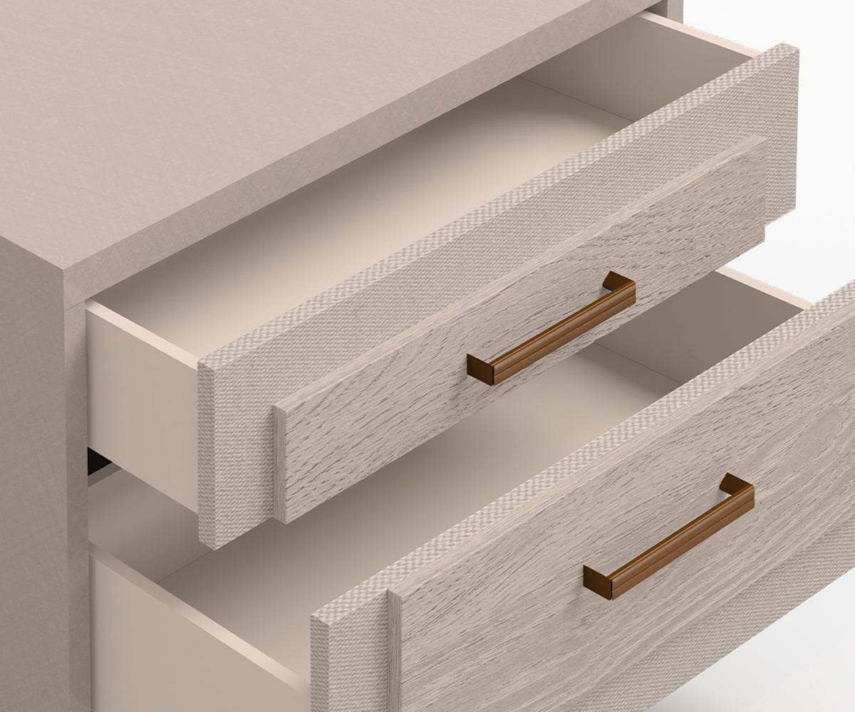 De fabrication italienne, la collection Antonella allie une esthétique rustique d'inspiration toscane, avec des détails typiquement provinciaux comme des incrustations en chêne blanchi et des ferrures en laiton, à une finition beige ultra-brillante et moderne. Le résultat est un élégant mélange de charme d'antan et de raffinement moderne, idéal pour s'agencer avec d'autres meubles Antonella pour un style personnalisé.
