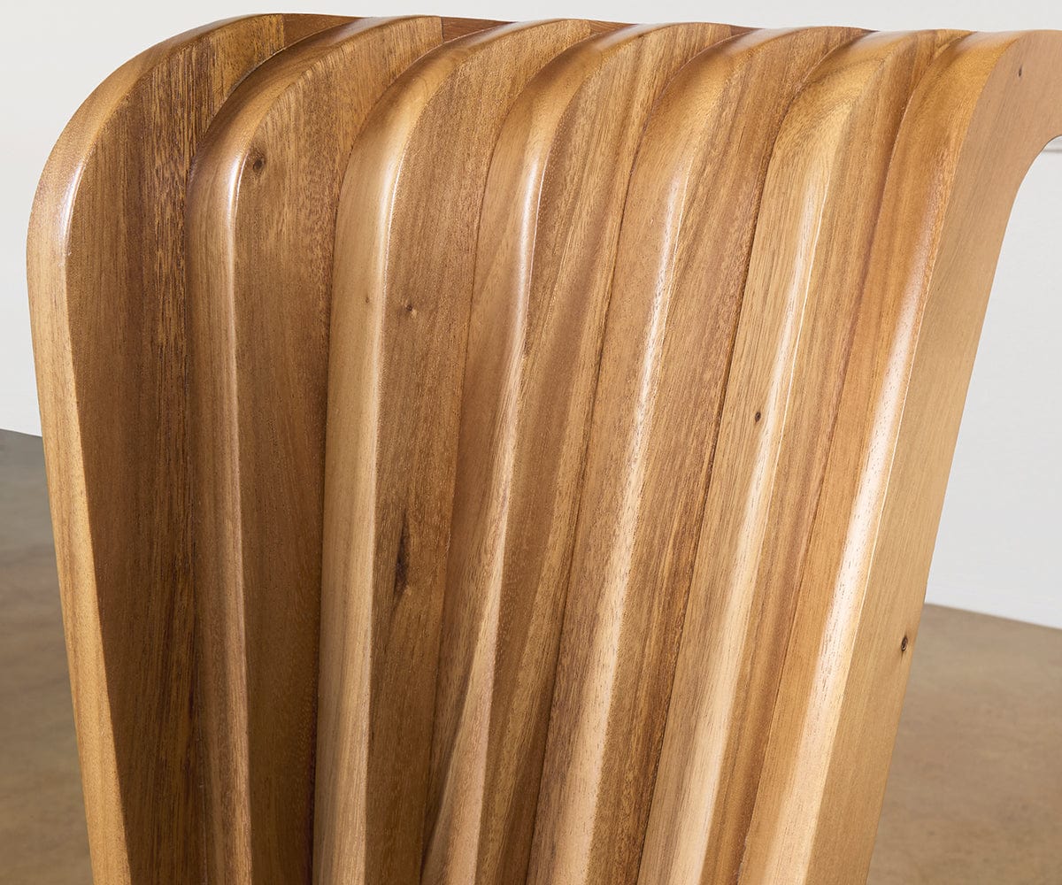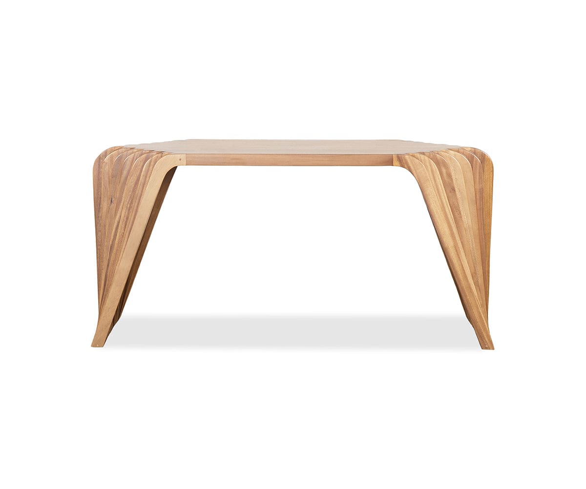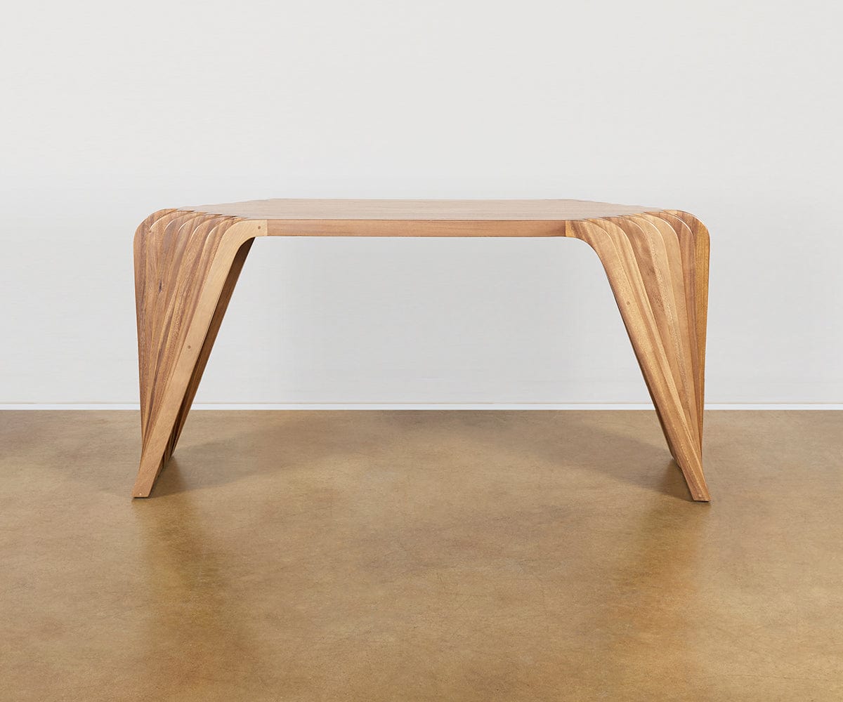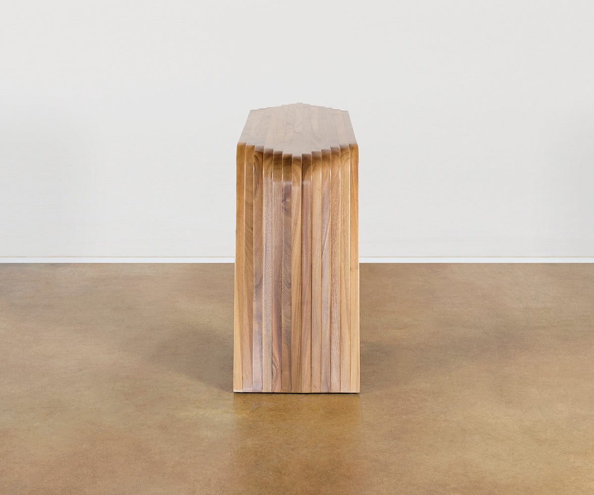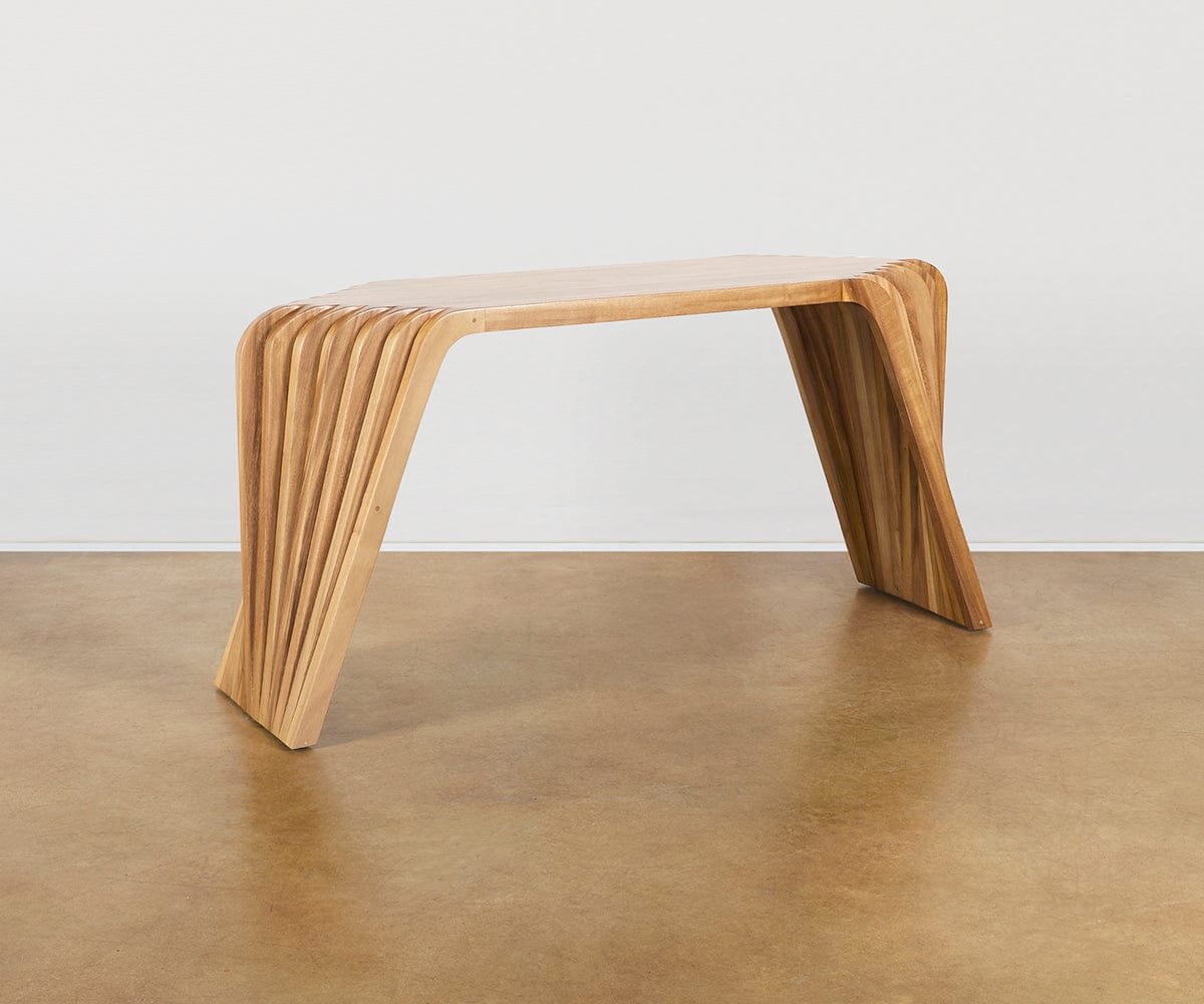 La console Nyssa présente une forme ultra-moderne à la texture unique, fabriquée à la main à partir de bois de suar, avec une finition naturelle pour mettre en valeur le grain.