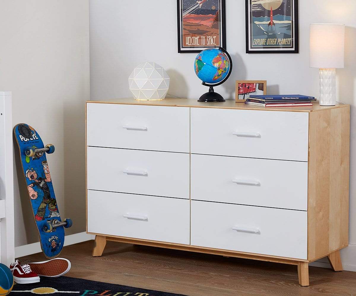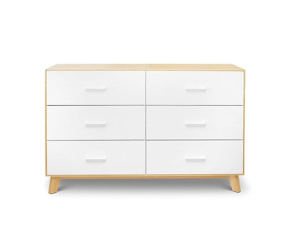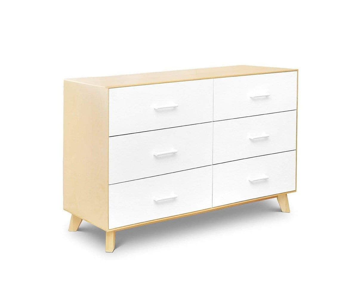 La commode double Rowan allie harmonieusement rangement et style. Le placage de bouleau et les façades de tiroirs peintes en blanc s'associent pour un design bicolore contemporain. Les six tiroirs sont dotés de poignées rondes, d'une fermeture amortie, d'une construction en queue d'aronde et d'un mécanisme de verrouillage de sécurité, tandis que les pieds en bouleau massif rehaussent le style.