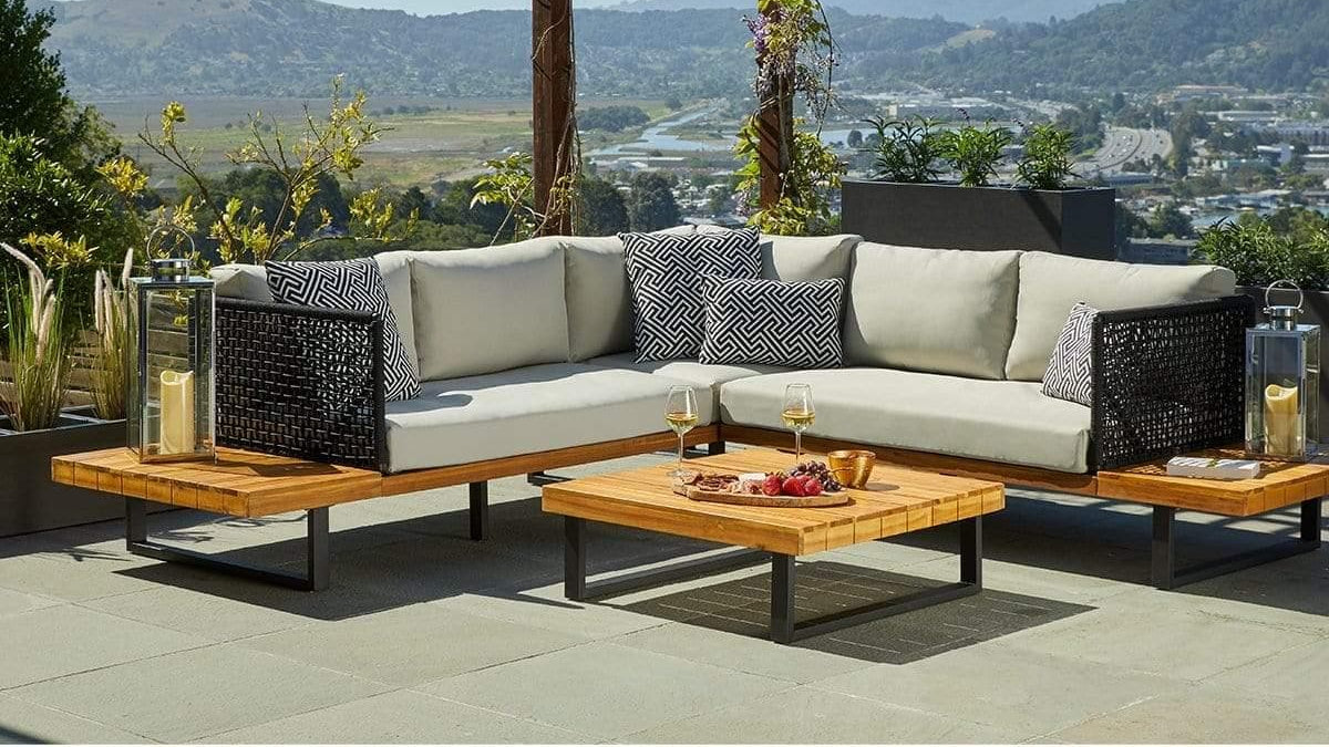 Le canapé d'angle d'extérieur Vila est doté de tables d'appoint intégrées. En acacia massif finition teck, ses pieds en métal thermolaqué noir s'harmonisent harmonieusement avec ses accoudoirs en corde noire. Ses coussins d'assise et de dossier rembourrés lui confèrent une durabilité appréciable, idéale pour les activités en extérieur.